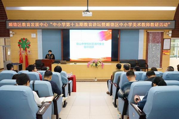 2019年12月27日下午,容山中学集贤楼报告厅济济一堂,来自全区中小学220多名美术教师以及区教育发展中心教师发展研究室主任唐信焱、副主任吴海坚,区美术教研员王育群老师齐聚这里,参加了一场别开生面的美术教研活动。活动由顺德区教育发展中心、顺德区名师工作室建设项目管理办公室主办,顺德区容山中学、顺德区刘磊名师工作室承办,容山中学侯柏羽老师担任活动主持。
