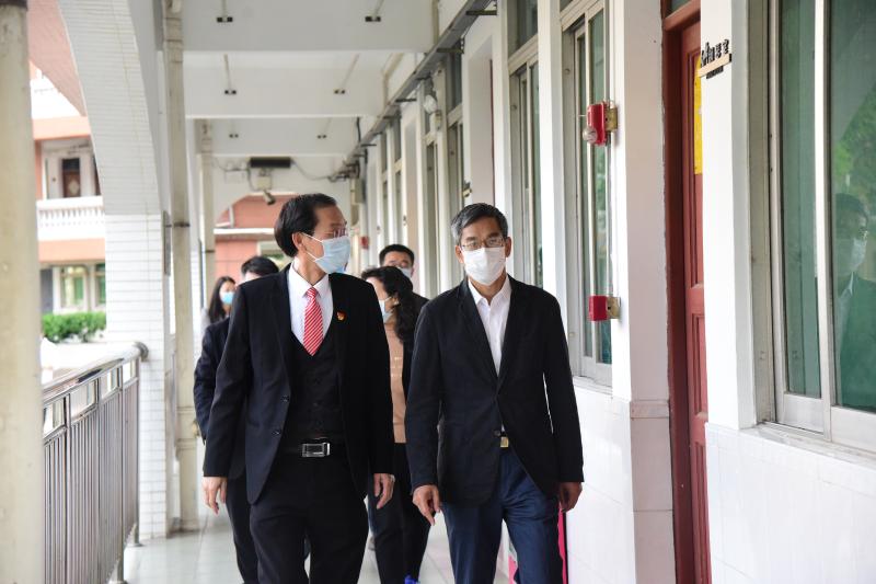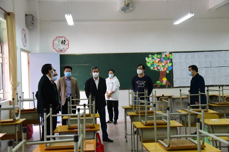 接着,周驭洪副主任一行在吴剑平校长及学校行政的陪同下,深入到教室、校医室、健康观察室、学生宿舍和学生饭堂等功能场室进行视察。