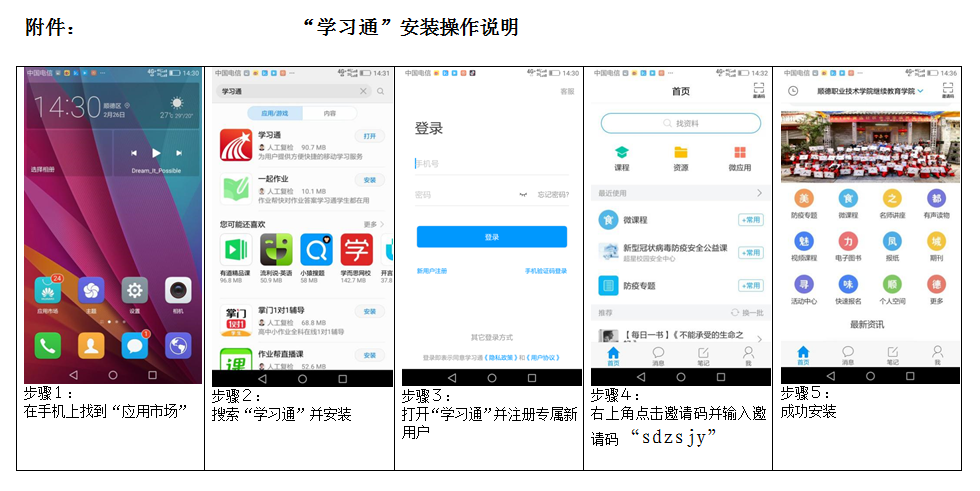 或者在手机“应用市场”搜索下载“学习通”App,进行注册设置专属账号,进入App首页点击右上角的“扫一扫”按钮,输入邀请码“sdzsjy”,即可免费学习各类教育资源(安装图解见附件)。