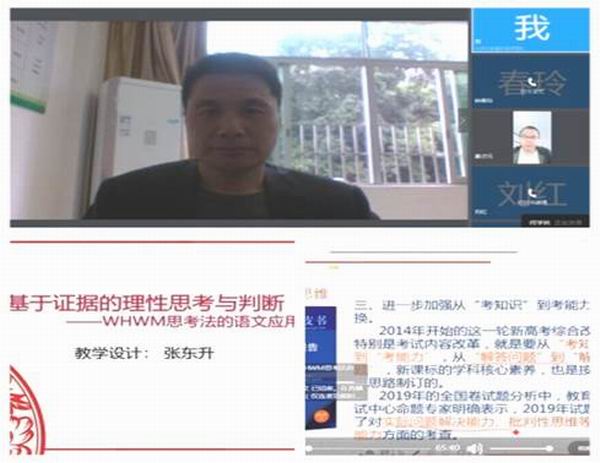 首先大家一起观摩由工作室主持人张东升老师主讲的“基于证据的理性思考与判断――WHWM思考法的语文应用”专题直播课,本节课受众为容山中学高二年级全体学生,工作室成员、“思维工具提升群文阅读能力”课题组成员参与听课。