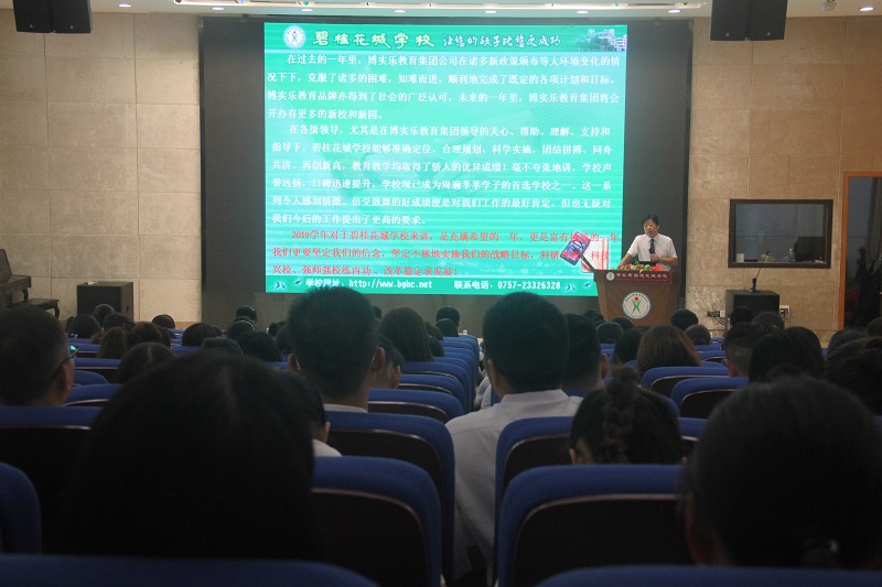 贺总首先介绍了我校暑假期间教师培训、招生、夏令营、毕业游、校园翻新等工作的相关情况,并回顾了过去一年里博实乐教育集团的发展变化,总结了过去一年碧桂花城学校所取得的骄人成绩。这些成绩让全体教职员工倍受鼓舞,深感骄傲。