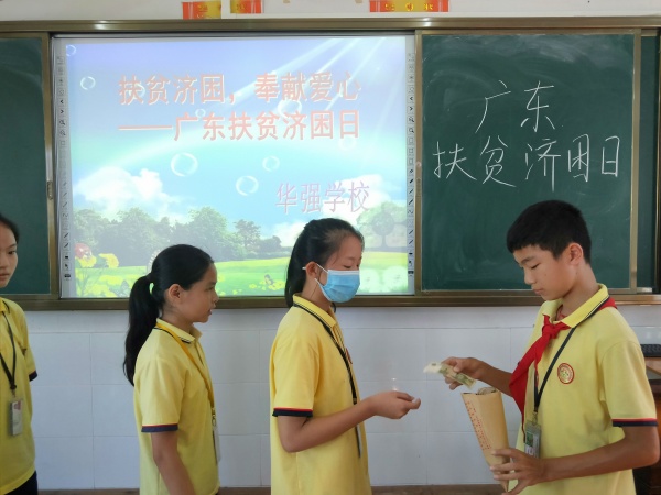 上周,德育处在校内进行扶贫济困宣教活动,让全体师生明白扶贫济困的意义。尤其是今年,受新冠肺炎疫情的影响,很多农村家庭的收入减少,有些群众生活困难,甚至再次返贫。他们的生活不仅受到党中央的高度重视,更引起了全社会的关注,各界人士纷纷伸出援助之手,帮扶困难群众,华强学子责无旁贷,大家积极响应,把自己手头上零花钱拿出来,奉献一份爱心,虽然不多,但涓涓细流可以汇成爱的海洋,帮助困难群众渡过难关。