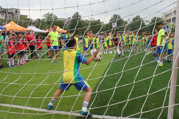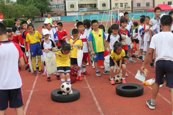 下午,就是队员们期待已久的游园活动了。活动前期,家长义工们协助老师一共准备了11个游戏,其中还有注入了很多快乐足球元素的活动,如“超级保龄球”、“射门挑战”、“双人夹球”、“瞎子踢球”等。亲子义工们到达划分好的场地,摆好道具,准备好奖品,明确分工后,在学校老师一声令下,游园活动就正式开始了。小朋友蹦蹦跳跳地跑出教室,一脸期待地挤在各个摊点看游戏规则,等待玩游戏。游戏火热地进行,队员们有的在足球门前下专注地踢球;有的控着足球拍小心翼翼地绕过障碍物奔向终点;有的用力地瞄准球门,用力射球;有的双腿夹着足球,轻轻往上一挑,把足球稳稳地停在大车胎里……赢得游戏后,小朋友们纷纷得到各式各样的奖品。