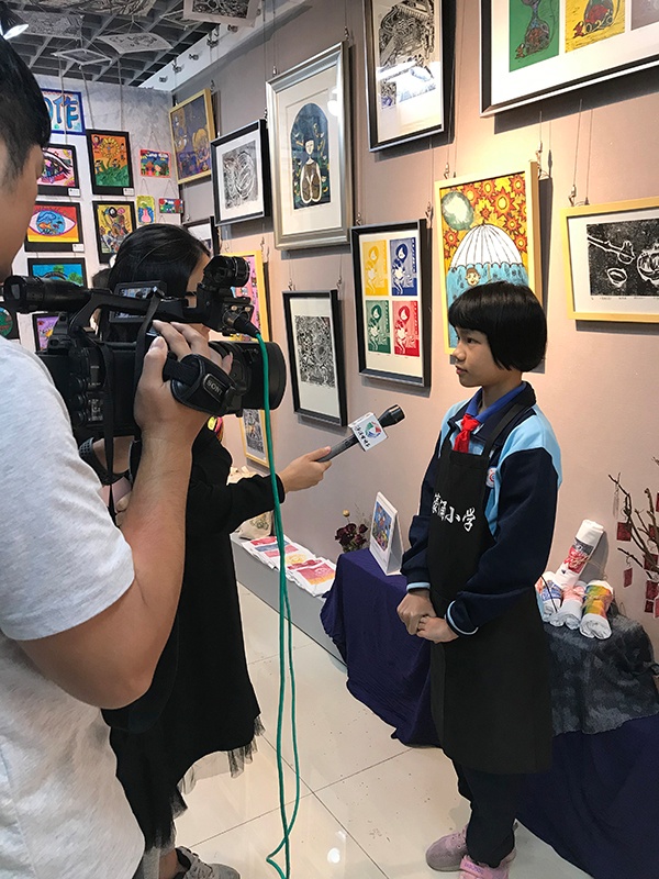 版画教学对于目前的美术课堂教学还是比较冷门,很多人不了解版画的制作原理和意义。通过这次展示活动,让更多的人亲身接触到版画,感受到它的魅力所在。尤其是学校根据本土特色文化进行版画教学,制作了一系列关于隆都文化的版画作品,比如沙溪人人皆知的“开门大吉”,学生从绘稿-转稿-刻制-印刷等过程呈现一幅幅精美的“开门大吉”,甚至用“开门大吉”手工制作了可爱精美的钥匙扣,引来了很多询问价格的人。除了印制“开门大吉”,学校还利用隆都文化主题的版画作品与沙溪的服饰相结合,印制了一批独一无二的衣服和手提包包。由于版画作品呈现的独特效果和现场热闹的氛围,把沙溪镇电视台也吸引过来了。濠涌小学六年级少先队员胡乐宜大方地接受采访,把学校的版印特色和制作版画带来的乐趣娓娓道来。