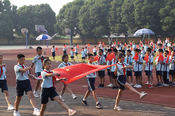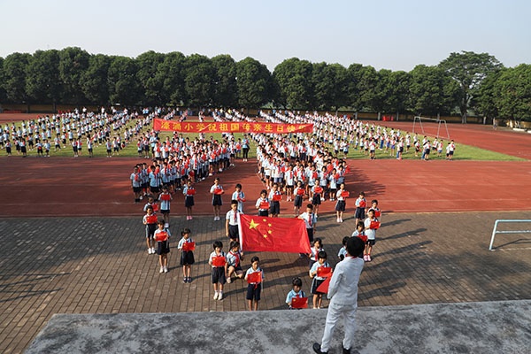 上午7:50,沙溪濠涌小学全校师生手持红旗,排着整齐的队伍进入操场,由四乙、六甲、六乙中队队员组成的“70”和爱心造型分布在操场前方中央,所有人都在静静地等待着;8:00,五星红旗冉冉升起,全校师生齐声高唱国歌。辜鸿雁校长作了“祖国在我心中”的国旗下讲话,她激励全体师生要热爱祖国,为中国的腾飞而骄傲,为生为一个中国人而自豪。“少年强,则国强;少年富,则国富;少年屹立于世界,则国屹立于世界!”少年人要努力谱写中华更璀璨的诗篇,像冰山上的雪莲,不怕风雪,像蓝天下翱翔的雏鹰,顶着风雨前进;要努力学习,勇敢拼搏,立志做个奋斗者,接过时代的接力棒,连接历史和未来,让祖国以昂然的身姿挺立于世界之林!