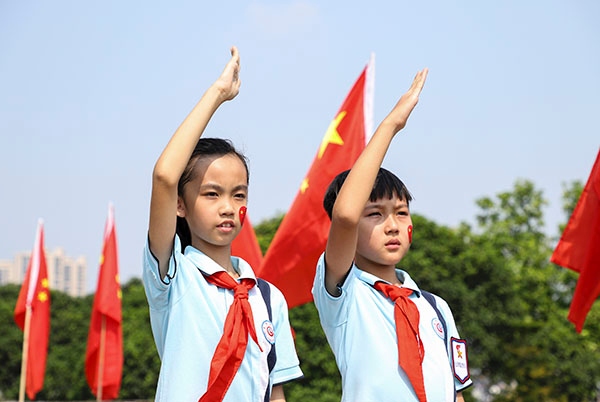随后,少先队员何元斌一首荡气回肠的《国家》将师生们的爱国热情推向高潮。濠涌小学的全体师生舞动红旗,齐唱《歌唱祖国》和《我和我的祖国》。在嘹亮的歌声中,爱心造型中央稳稳托起一面鲜艳的五星红旗。全体师生共同呼号:祖国万岁!祖国万岁!