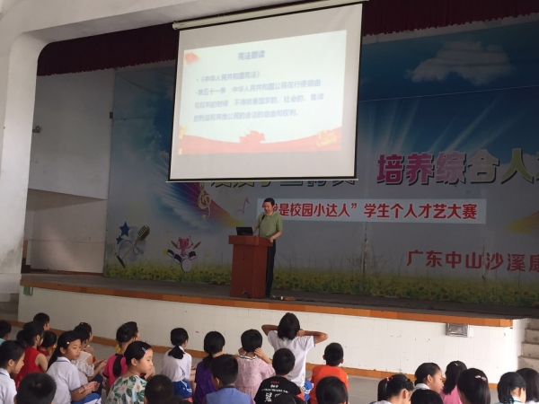 为贯彻落实上级关于宪法学习宣传教育的指示,弘扬宪法精神,培养学生学法、知法、守法、护法的意识和行为,营造校园法治宣传氛围。5月31日上午,沙溪镇康乐小学邀请了广中律师事务所张爱文律师为四、五、六年级学生开展了一场以“宪法在我心中”为主题的宪法教育大讲堂讲座活动。本次讲座在康乐小学大礼堂举行,康乐小学吴伟标校长、政教处沈光元主任、四五六年级各班班主任及学生近500人聆听了本次讲座。
