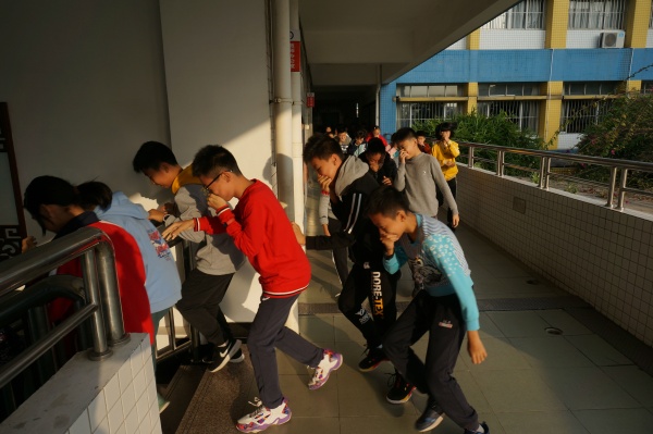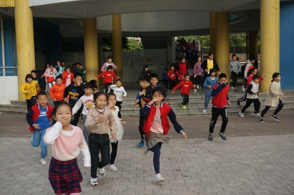 上午8点10分左右,一阵急促的警报声响起,老师们迅速到达指定岗位,不断提醒学生“不要慌”、“不要急”,各班同学在老师的指导下用湿毛巾等捂住口鼻,弯着腰,紧张而有序地按照指定路线撤离到安全区域。历时不到2分钟,全校师生全部安全地撤离到篮球场,各班主任清点人数后,向疏散组组长报告。疏散组组长将集合情况及时汇总后向黄金奇校长报告。