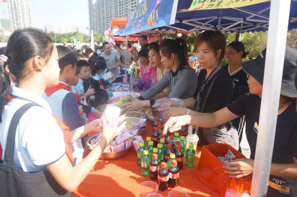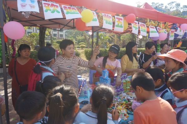 当天下午,义工家长们早早来到学校布置摊位,每个“商铺”的海报设计都别具特色。两点十分,义卖活动正式开始,同学们有序进场,校园恍如“集市”一下子热闹起来,人声鼎沸。各班义卖物品琳琅满目:漂亮的学习用具、新奇有趣的玩具、让人垂涎欲滴的美味小吃、种类繁多的饮料还有同学们捐献的闲置书籍等等。除了商品的多样性外,经营方式更是精彩纷呈,创意无限。有的通过展示才艺的来吸引顾客眼球,还有的穿着恐龙服装来招揽“顾客”,有的变身成一名小小推销员,抱着义卖物品四处奔走、叫卖,更有的孩子固守摊位,分工合作,有的叫卖、有的理货、有的收钱,忙得不亦乐乎。义工家长们各出奇招,卖力地推销,还有不少热心的家长也加入到义卖的队伍中。孩子们边逛边玩,丢圈圈,捞小鱼,吹乒乓球,砸金蛋等等,玩得不亦乐乎。一时间,欢笑声,叫卖声,讨价还价声,场面热闹非凡,汇成一片欢乐的海洋。