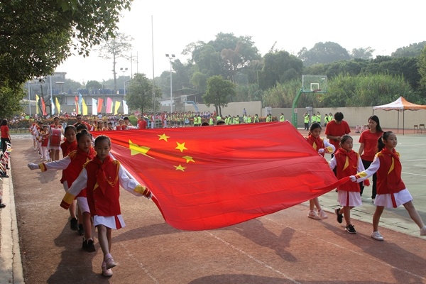 校园里,到处都洋溢着欢乐的气氛。学校的操场上站满了整齐的各年级方队,同学们精神饱满,站姿挺拔,主席台上的校领导和嘉宾们神采奕奕,笑容满面。伴随着主持人雄壮有力的声音,《运动员进行曲》激昂的旋律响了起来,最先入场的是圣狮小学国旗方队,护旗手高举鲜艳的五星红旗,脚踏坚实稳健的步伐,鲜红的五星红旗在迎风招展,同学们向庄严的国旗敬礼,胸前鲜艳的红领巾飘起来。紧跟着国旗队出场的是校旗方队、亲子义工队。最后进场的方队是十二个班级的开幕式进场竞演。