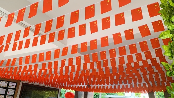 一进入校园圣狮小学变成红色的海洋。高高挂起的灯笼,随风飘扬的国旗,营造出喜迎国庆的良好氛围,孩子们在一片喜庆的环境熏陶下,拼发出爱国之情和民族自豪感。