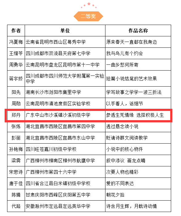 沙溪中学郑丹老师荣获全国“初中群文阅读录像课大赛”二等奖发布时间:2019-04-11 16:25 信息来源:本网站 浏览次数:48