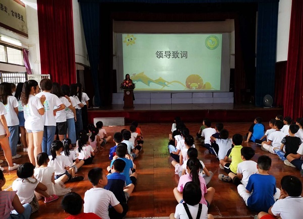 7月8日早上,青马服务队英语夏令营见面会在中山市申明亭学校礼堂顺利举行。申明亭学校郑育美校长和宁吉红、赖强强、刘志雄三位主任和参加夏令营的学生,以及全体青马服务队的队员参加了见面会。