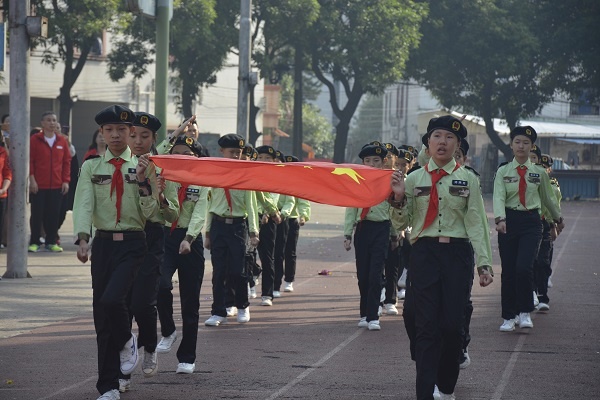 全体运动员进场完毕后,紧跟其后的是由学校领袖团同学组成的国旗方队,他们统一着装,英姿飒爽,高高举着鲜红的旗帜,迈着整齐划一的步伐进场。在庄严的升旗仪式之后,郑校长热情激昂地为本届运动会致辞,她首先对本次运动会的顺利召开表示了热烈的祝贺,向全体运动员、裁判员和为本届运动会积极筹备而付出辛勤汗水的工作人员表示亲切的问候,并且希望运动员们顽强拼搏,超越自我,赛出风格;希望裁判员们能公正执法,恪尽职守,并预祝本次运动会取得圆满成功。紧接着,裁判员代表宣誓,保证严格执法,营造良好的比赛环境,保证本届运动会的圆满成功。运动员代表宣誓,承诺会严格遵守比赛规则,赛出风采。