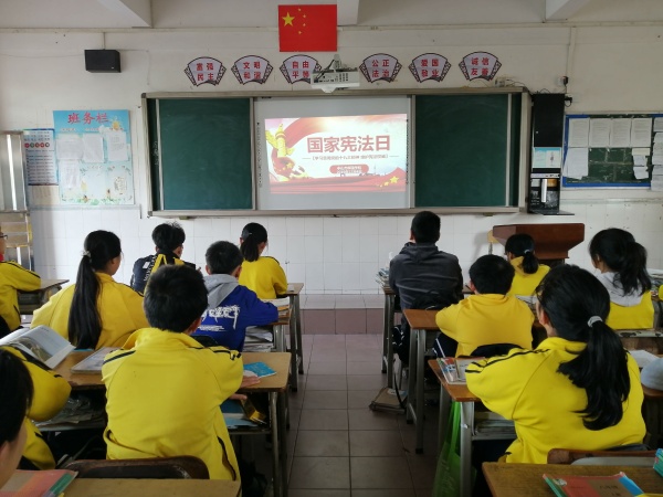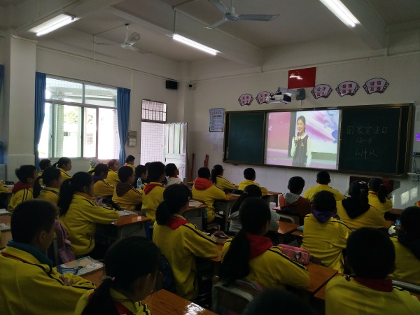 宪法是国家的根本法,是治国安邦的总章程。宪法教育是法治教育的首要内容,也是学校开展法制教育的根基,是每个学生的必修课。12月4日的第一节课上,在学校的统一安排布置下,华强学校的各班班主任组织学生朗读了宪法中的部分章节。观看本校制作的宪法PPT课件,同学们严肃地凝视着大屏幕,边朗读边进行理解、记忆,朗朗的晨读声回荡在华强学校的校园里,使人肃穆。上午9:00时,全校38个班级共同观看普法网上直播视频,认真聆听了里面每一位学生的精彩演讲,全校学生受益匪浅。