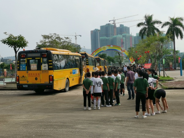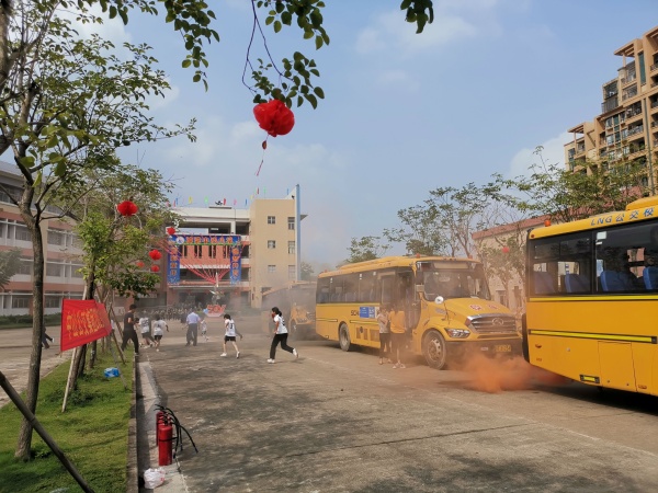 上午10点整,急促的警报声打破了校园的宁静,总指挥谭瑞香校长宣布演练正式开始,并向全校发布“掩住口鼻,弯腰前行,有序小跑”的疏散指令。话音刚落,只见各年级各班学生在班主任及各楼层值岗老师的组织带领下,有序快速地经由预定的撤离通道和路线到达了集合点;在校车上的学生,有序地由校车的跟车人员带领着沿疏散路线撤离。