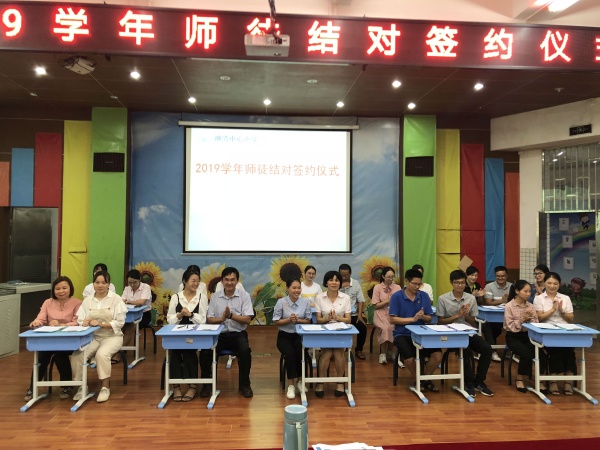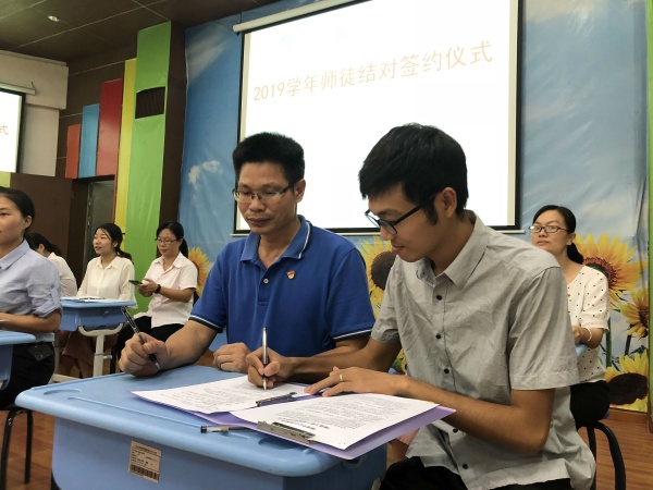 活动中,廖主任宣读了“师徒结对”教师名单,随后,张玄、龚道林、熊静婉等九位青年教师与师傅一起签写了教师专业成长“青蓝工程”师徒结对协议。