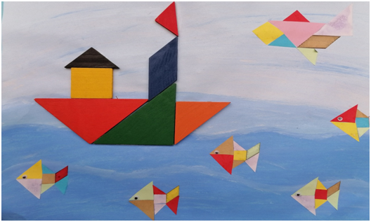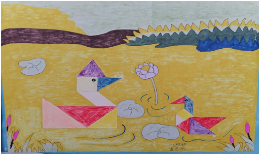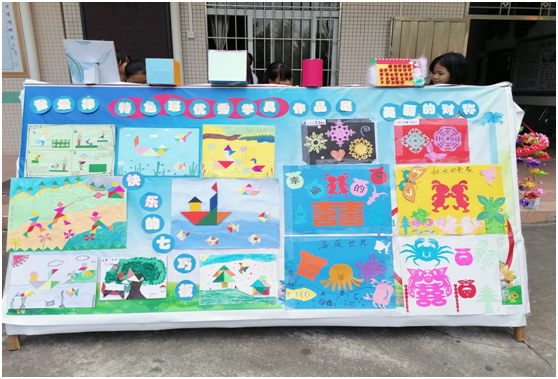 一年级孩子积极动脑,充分发挥自己的想象力和创造力,用七巧板拼出各式各样的图案来。有的拼成了一只可爱的小猫,有的拼成了一艘远航的帆船,有的拼出了狐狸和乌鸦的故事,有的拼出了守株待兔的故事。简单的七巧板在孩子们手中拼出了丰富多样的图案。二年级孩子制作的是轴对称图形。孩子们充分发挥想象力,用不同颜色的卡纸巧妙搭配,剪一剪,拼一拼,涂一涂,一件件精美的作品就此产生。有丰收的秋天,有海底世界,有幸福的温馨之家。三年级孩子制作的时钟具有较高的欣赏和实用价值。时钟造型独特、千奇百怪,制作精美。你瞧——有的把钟表设计成动物的形状,有的在时钟上绘制各种精美图案,真让人赞叹不已!