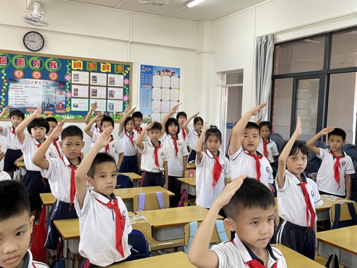 8点30分整,伴随着国歌声响起,教师庄严的目光,全体学生标准的少先队礼,庄严嘹亮的国歌声响彻在高家基小学上空,目光都凝望着徐徐升起的国旗。高昂的声音,饱含对祖国的热爱,内心的激动溢于言表,祝福祖国母亲繁荣富强。随后,高家基小学大队辅导员张志婷老师带领全体少先队员面向党旗、团旗、队旗敬礼、唱队歌、重温入队誓词、庄严呼号,全体少先队员表达了自己对祖国、对党的诚挚祝福以及为实现强国梦,努力学习、奋发向上的决心。