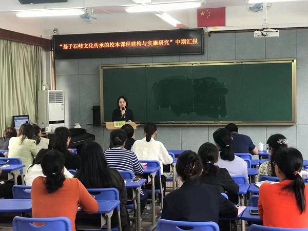 接着是两个课题的主持人分别进行中期研究汇报。郑结霞校长主持“基于石岐文化传承的校本课程建构与实施研究”这个课题。她从课题研究概述、前期研究基础、中期研究状况和后期研究思路四个方面进行了详尽汇报,既展示了课题研究的研究成果,更展示了她的管理情怀。田雅老师主持“思维发展与提升视角下小学中段童话整本书阅读教学的实践研究”课题,她人从课题研究背景、研究思路、阶段性研究成果、研究效果、问题展望五个方面汇报了课题进展,提出了课题研究的困惑。