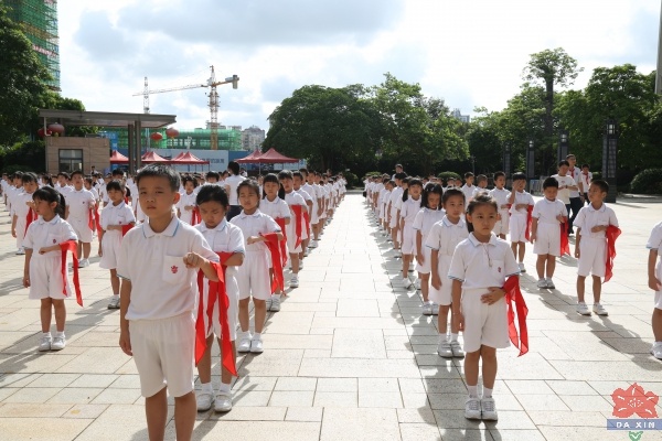 艳阳高照的六月热情似火,石岐中心小学大新学校校园内队歌嘹亮,全体校领导和一年级师生在升旗广场上为104名2019级一年级学生隆重开展了第一批新队员入队仪式。孩子们身着整齐的校服,脸上洋溢着灿烂的笑容,他们期盼已久的时刻终于来临了——加入光荣的少先队组织。