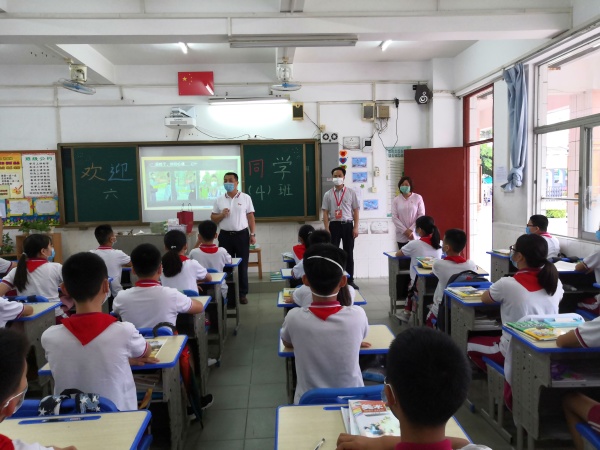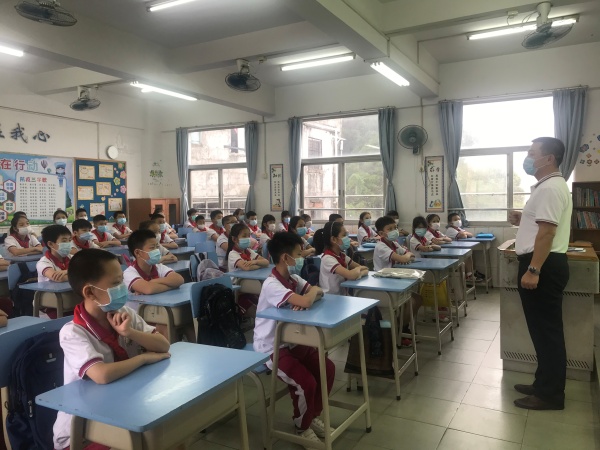 5月18日是中山市中小学第三批学生返校的第一天。早上,中山火炬开发区第一小学的同学们刚刚进校不久,一场大雨突如其来,让原本安排好的升旗仪式只能改为室内进行。升旗仪式结束,学校常务副校长刘光旗同志打着雨伞带领全体行政直奔教学楼,来到每个复学班级探望学生,跟学生们面对面交流,向同学们传递学校的关心和温暖,为同学们疫情下的复课学习鼓劲加油。