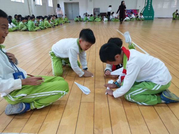 “预备!”随着一声响亮的哨声,看那些小选手,站在起飞线前,朝气蓬勃,满脸自信,只见他们右手一扬,做出一个投掷动作,纸飞机一道弧线划破了上空,滑出了长长的飞行轨迹。经过测量,最远的纸飞机飞至20米远,学生俏皮地说:纸飞机飞得远的秘诀是在投掷之前用嘴“呵”一口气。