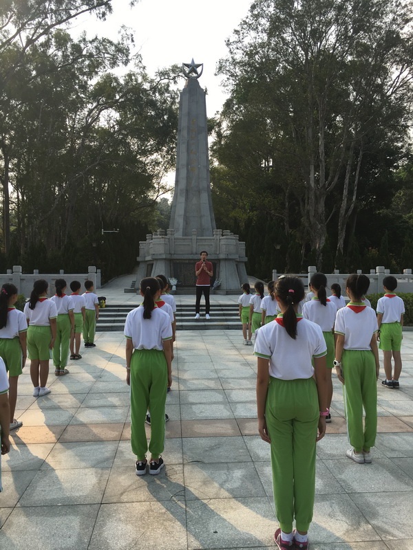 学校德育处副主任王铎、大队辅导员杜沁源和部分党员代表带领着学校三十名少先队员到达中山革命烈士陵园后,整齐地站在革命英雄纪念碑前。
