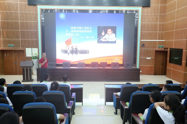 9月12日下午,开发区香晖园小学党支部书记、校长陈泽湖在学校报告厅为该校五年级全体学生讲授题为“我和我的祖国”的本学期第一堂思想政治教育课。