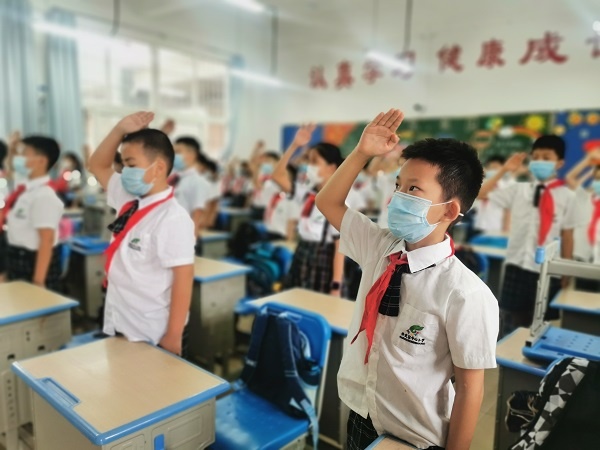 惠风和畅,鸟语花香,凤凰花开,少年归来。在经历了一个漫长而又难忘的寒假,终于迎来了四、五、六年级学生复学返校。5月18日,开发区中心小学举行了复学返校的第一次升旗仪式,伴随着庄严的国歌,五星红旗冉冉升起,全体学生在教室里面向国旗行少先队礼,全体老师行注目礼。