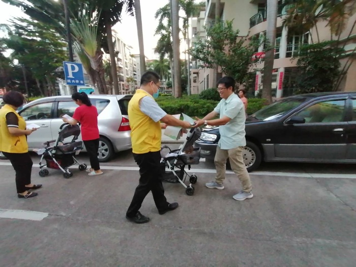 当天傍晚,在三小唐秉晶校长的带领下,开发区第三小学志愿者走进了濠头联富社区尚城小区、丽港城小区,协助社区干部派发创文倡议书以及帮助居民进行创文小知识问卷等。
