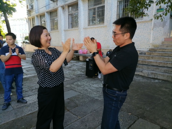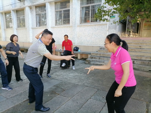 在心理老师的带领下,活动开始。热身活动“桃花朵朵开”营造了轻松欢快的气氛;“大兵步操”活跃气氛,同时让教师们打破疫情下诸多新规带来的不确定感;“为自己鼓掌”让教师在自我挑战中树立信心;“划拳接力赛”进一步激发了教师们的热情,释放了压力,使活动达到高潮;最后,全体教师围成一圈进行总结分享,感染彼此的生命活力,增强了团队凝聚力。