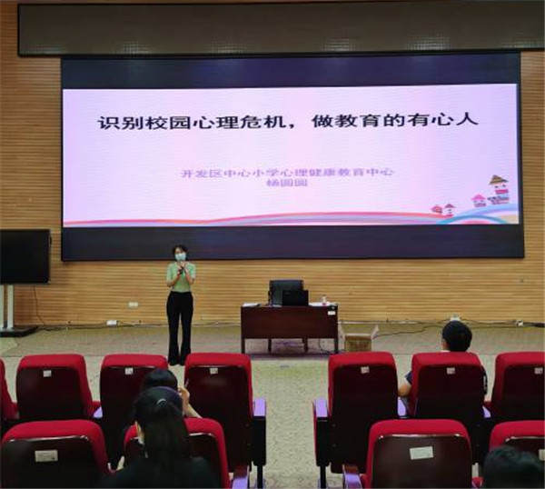 在疫情特殊时期,为全面保障校园安全,提高全体教师识别及应对校园心理危机的能力,学校专职心理老师杨圆圆在全体教职工工作会议上开展《识别校园心理危机,做教育的有心人》的专题培训。