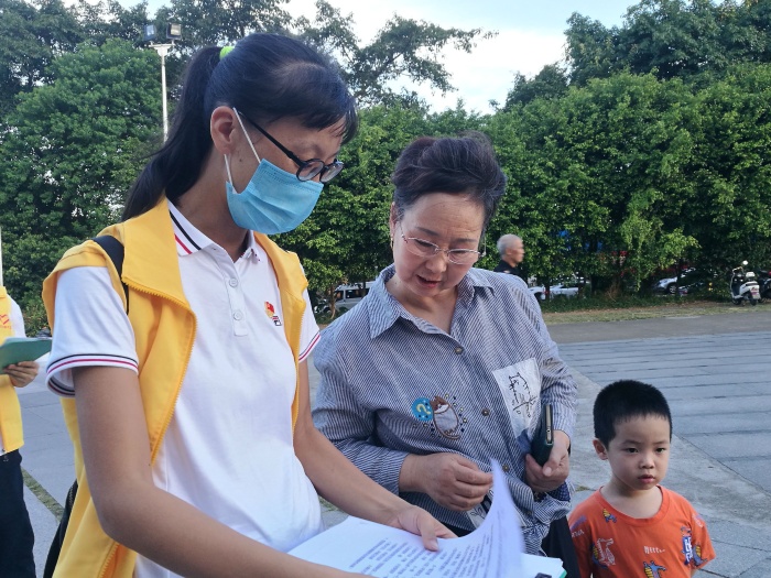 当天傍晚,在三小唐秉晶校长的带领下,开发区第三小学志愿者走进了濠头联富社区尚城小区、丽港城小区,协助社区干部派发创文倡议书以及帮助居民进行创文小知识问卷等。