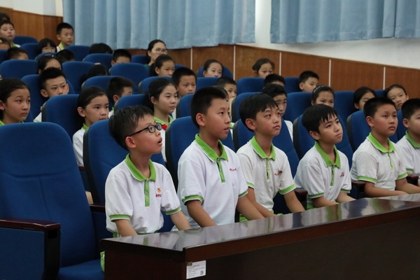 9月12日下午,开发区香晖园小学党支部书记、校长陈泽湖在学校报告厅为该校五年级全体学生讲授题为“我和我的祖国”的本学期第一堂思想政治教育课。
