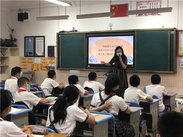 在上午第一节和第二节的课堂上,各班班主任老师和学生们亲切交谈,积极营造轻松和谐的班级氛围,结合学校新制定的疫情期间学生一日常规,教给学生科学防疫的方法,还将安全、爱国、心理健康、生命教育等内容进行融合,通过图片、视频、故事等形式深入浅出地进行教育,引导学生积极迎变,提升心理弹性,提高对生命的敬畏和珍惜。