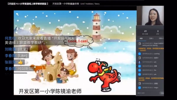 此次四校联盟研讨中,除了四校的英语教师、英语科组长和区英语中心教研组组长参加外,还邀请了开发区第一小学蔡长青副校长、开发区第一小学李春雨副主任及其他兄弟学校的部分英语教师一同参加了研讨。活动首先通过线上同课异构的教学形式,分享了联盟学校过去两个月英语线上教学的情况;主要由开发区第一小学陈镜渝老师和第四小学孙意云老师进行线上直播教学,她们以不同的教学形式展示了四年级下册“Unit7 Hobbies(Story)”的教学。她们在授课过程中,利用钉钉平台的连麦、语音、互动面板等功能,营造活跃互动的课堂氛围。