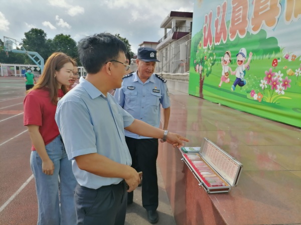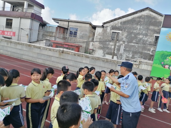 刘警官现场向学生分发宣传单张,让学生自己学习,并发挥小手拉大手的力量,向家长普及防诈骗、禁毒的知识,提高防诈骗、禁毒的意识。