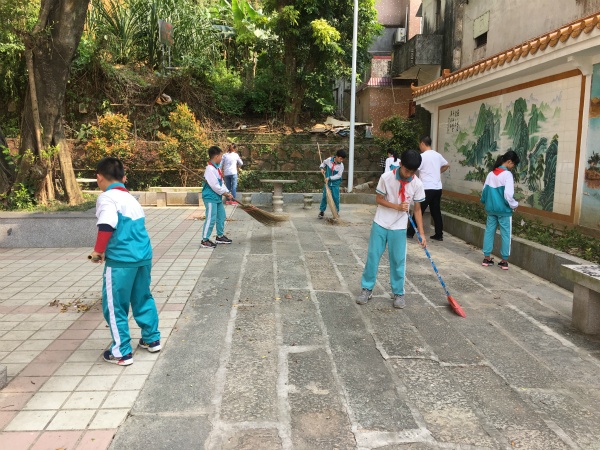 到达沙边村良德公园后后,负责本次活动的罗老师安排好劳动范围。对队员和家长进行分组,定好负责组长,并强调注意事项。接着队员们三个一群,五个一伙,就开始热火朝天的干起来。队员们不怕脏、不怕累,捡起石凳下的白色垃圾和丢在绿化丛中的所料袋;还有的地方有口香糖印,他们采用喷水、用铲子铲的方式,让公园的地面变得干净起来。在有些地方有些不易发现的烟头和枯树叶,他们也一点一点扫进垃圾铲。在队员们的共同努力下,公园地面的纸片、草丛中的垃圾袋都不见了,队员们看着自己劳动成果,都感到非常欣慰开心。