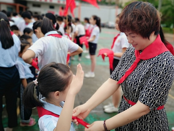 2019年5月31日,中山市火炬开发区新苗学校的校园里,队歌嘹亮。一年级和六年级的全体师生聚集在国旗下,举行了隆重的新队员入队仪式。