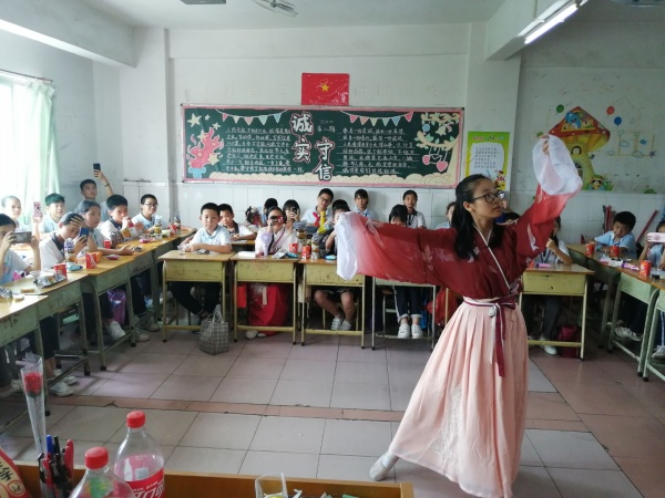 活动中,各班学生早早将教室桌椅摆放好,分小组坐好,并拿出自己精心准备的各种美食,与老师,同学们分享。同学们一边品尝着美食一边观看表演。有的班级以传统活动为主,如:猜谜语、抢板凳、撕名牌等游戏穿插到节目中,教室里充满了学生的欢歌笑语。有的班级以“歌唱祖国、献诗给祖国”为主题,展示着各自的才艺,有合唱,诗朗诵、舞蹈等节目,脸上洋溢着幸福的微笑。有的班级活动内容形式多样,如:击鼓传花、歌曲串烧、气球运输等节目。表达着心中的喜悦之情。同学们通过不同的节目形式,展现了当代少年儿童热爱祖国,朝气蓬勃、昂扬向上的精神风貌。