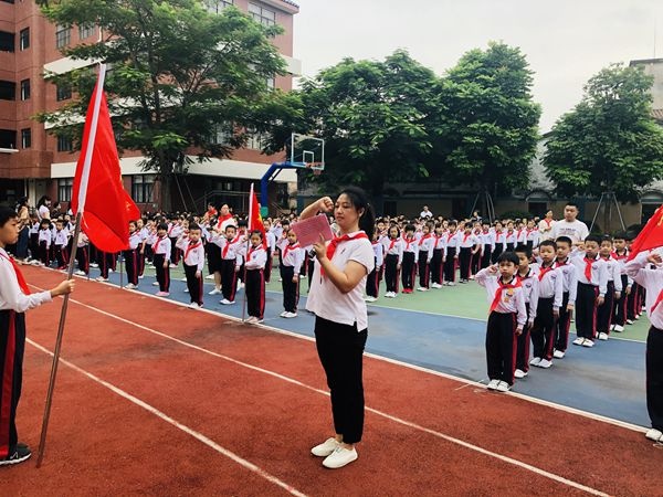 活动主题是童心永向党,争做新时代好队员。全体立正,仪式开始。出旗,奏出旗曲,全体队员敬礼,唱队歌,大队委员会宣读组建二年级少先队组织决定,大队辅导员张志婷老师宣布新队员名单。三年级队员为新队员及新辅导员授红领巾,佩戴好红领巾后互敬队礼;新队员宣誓,由大队辅导员领誓;然后吴婵娟主任为新建中队授中队旗,为新建中队聘请中队辅导员,授聘书;新队员代表区艳明老师讲话,大队辅导员讲话,呼号,退旗,奏退旗曲,全体队员敬礼。整个仪式在圆满和谐的气氛中圆满落下帷幕。