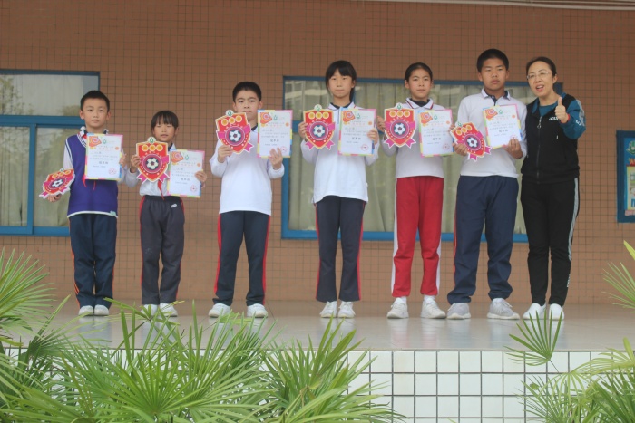 首先出场的是五(5)班同学的啦啦操表演,热情洋溢、青春活力的表演赢得观众阵阵掌声。之后,踢进10球的六(5)班何昀珊同学作为最佳射手代表讲话。在本届足球赛中共有9名同学获得了最佳射手奖。接着进行颁奖仪式。校长们为校园足球赛中获奖班级颁发奖牌,为最佳射手们颁发奖状,为跳绳比赛和50米跑比赛中各年级前十名的选手颁发奖状,同时为参加市区各项体育竞赛获奖的选手颁发奖状。历时近2个月的体育节活动,同学们积极参与、奋勇拼搏,收获了各自的成果,颁奖是对他们努力的肯定。紧接着,鄂校长对本次体育节活动进行总结,并宣布体育节暨第六届“校长杯”校园足球赛(第一轮)闭幕,五彩缤纷的礼花在舞台上空飞舞,给体育节闭幕式带来欢庆和喜悦。