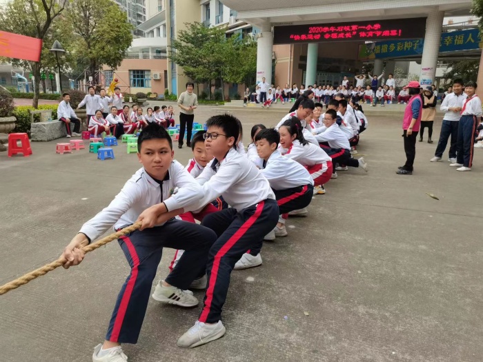 闭幕仪式后,全校分年级开展拔河比赛。比赛采取三局两胜单败淘汰制,现场分组抽签对阵,每班各派出15名男生,15名女生参加,每场后可更换人。现场比赛激烈,选手们用尽全力,加油声此起彼伏,整个校园热闹非凡!经过激烈角逐,一4班、二5班、三2班、四3班、五1班、六5班分别荣获年级冠军。