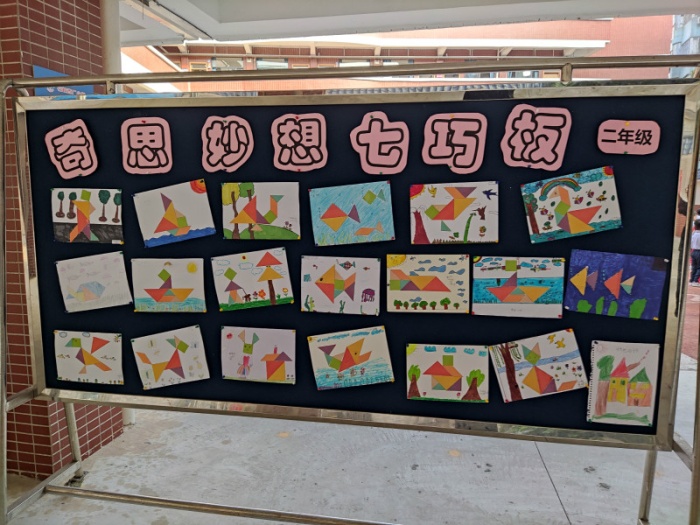 校外的知识拓展活动主要展示学生丰富多彩的数学作品,如一年级的有趣拼搭、二年级的奇思妙想七巧板、三年级的图形变换、四年级的生活中的数学(条形统计图)、五年级的创意多边形、六年级的寻找圆中的秘密。通过学生的精心准备,通过图画和手工创作,展示出学生对数学文化的认识。此次比赛共评选出160幅优秀作品进行展示。