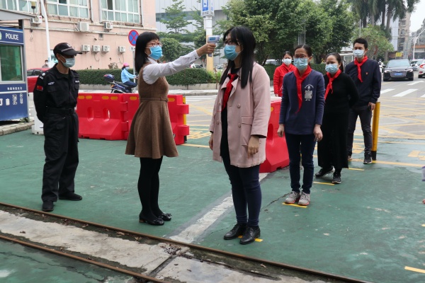 要求学生排队入校园,互相间隔1米,进入校门两位老师在校门口内负责测量体温,两位老师随机询问学生。(若发现有体温高于37.3°C,立刻由值班老师带至隔离观察区,经专门通道至师生发热临时隔离观察室,第一时间联系家长,同时询问是否有疫区旅居史,如果有第一时间和疾控中心部门联系,同时上报教体局。)体温正常,无感冒、咳嗽症状学生按既定路线依次进入校园。