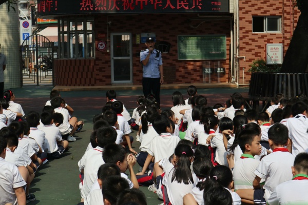 下午2:10分左右,校园内突然响起了消防警报铃声,各班正副班主任迅速引导学生快速疏散。教师带领学生捂住口鼻,弯腰撤离,各楼层导护教师在楼梯拐角处协助学生撤离,指导帮助学生如何安全地通过楼梯,沿着学校指定的出口逃生,有序地到达操场安全地带。整个逃生过程中,学生基本做到下楼梯快速行走,无强行冲、挤行为,动作迅速,不慌乱。整个撤离时间在1分50秒之内完成。随后,学校安全主任潘杰对本次疏散演练进行了总结,学校的法制校长吴健强警官除了观看整个逃生过程,还对学生有序疏散进行了肯定和表扬。同时也对全校学生进行了简单的国庆长假的安全教育。同时,社区的民警叔叔们送来的安全教育宣传的横幅。