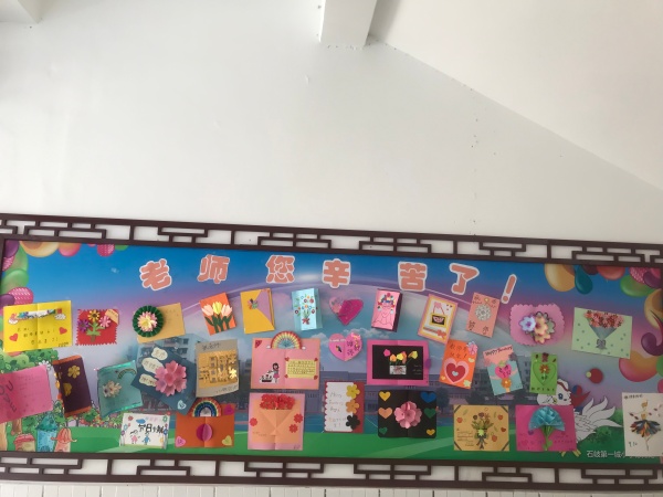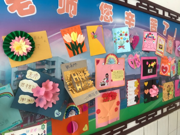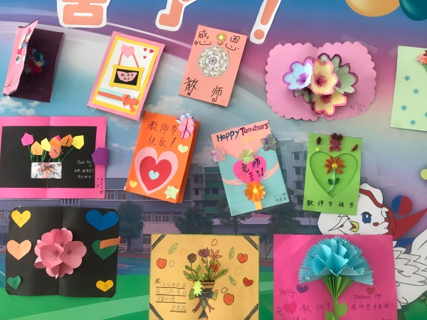 今天,校园里德育处的宣传栏格外引人注目。上面贴满了孩子们亲手为老师制作的贺卡。精致的纸花,稚嫩的笔迹,贺卡的样式不尽相同,却都洋溢着对恩师真挚的问候。