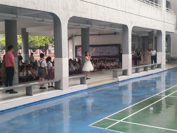 第一项,首先由洪杰琳演唱悦耳动听的《我和我的祖国》,接着在两位小主持甜美高亢的声音中以及庄严的国歌声中拉来开了序幕,师生们怀着崇高的敬意高高举起右手,寄托着自己对石岐第一城小学未来的美好憧憬与祝愿。