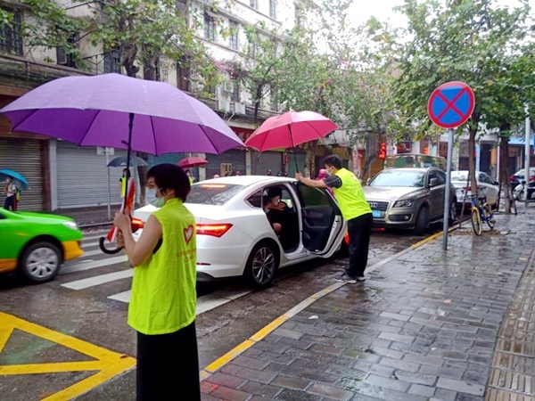 强对流天气带来短暂性暴雨,学校护卫队坚守岗位,开始第一天的护校工作。为了保障顺利开学,早上6:50他们就早早来到高家基巷口,换好值日服装,戴上防护手套,开始晨间工作。他们兵分多路,有的在路口疏导交通,有的引导家长有序停车,还有的护送学生过马路。他们人数不多,但是分工明确:一部分是负责协助路边下车的学生,拦停机动车道车辆,以确保自身安全及学生能安全通行;另一部分是负责开关私家车车门,接送学生,以免造成道路拥堵。并且,由于在疫情期间,护卫队队长特别强调:“所有队员在值岗过程中不能触碰学生及学生物品,人与人间保持至少1米以上安全距离,戴一次性手套。”这一个个细节展示了学校护卫队工作的细致、认真和用心。